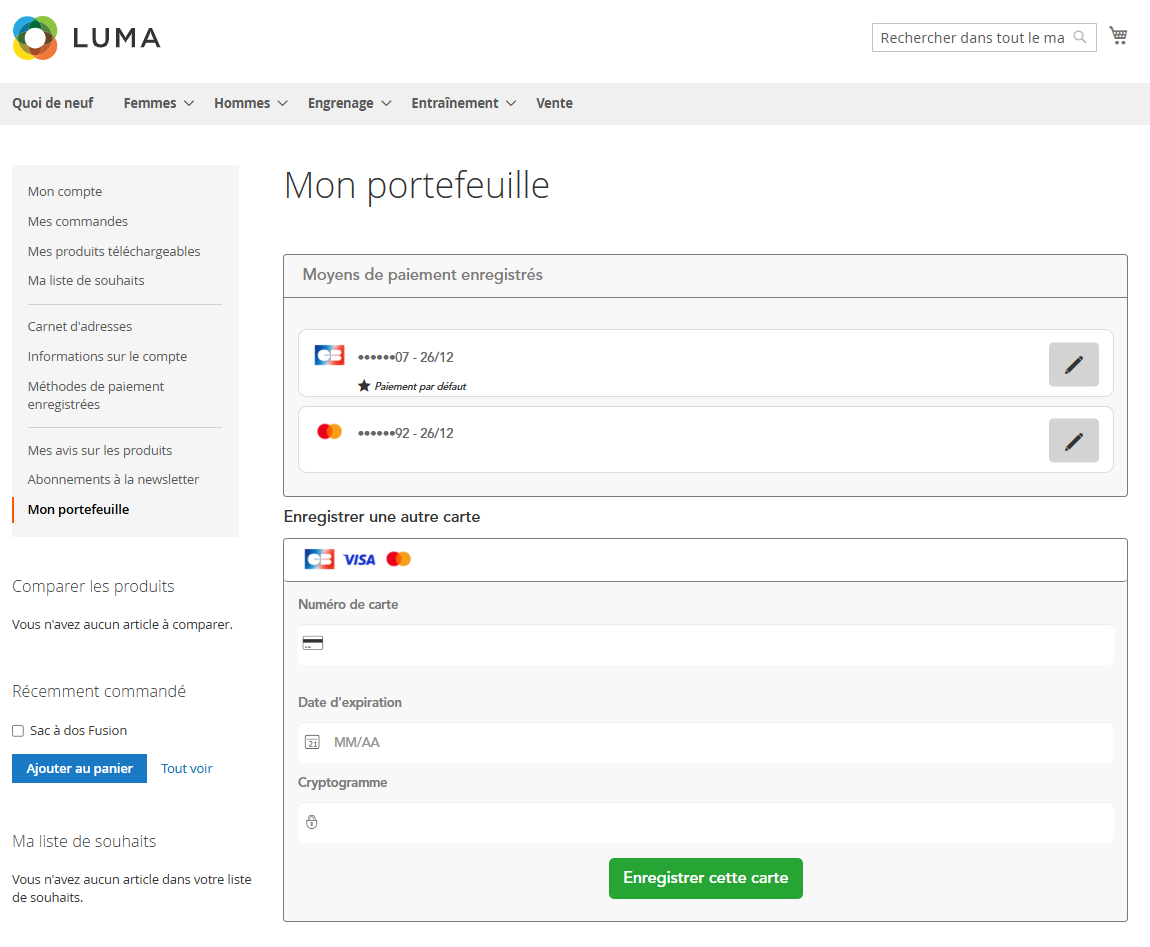 Dans le menu portefeuille, l'acheteur peut gérer ses cartes : ajouter, supprimer ou mettre par défaut.