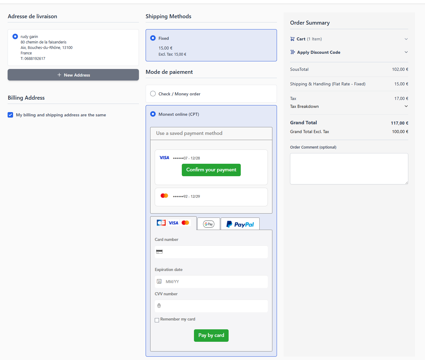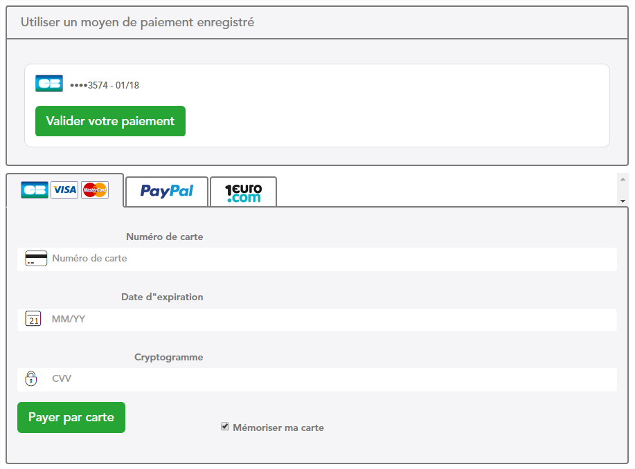 Une fois la carte enregistrée, elle est proposée sur l'interface pour permettre le paiement "en 1 clic", sans ressaisie des données de paiement :