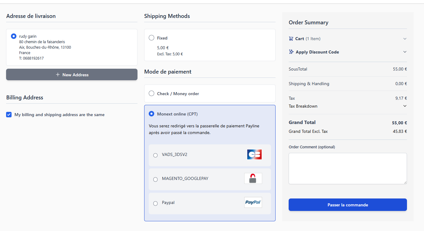 Puis une fois la commande validée en Template Hÿva OnePage ou template Hyvä Default, la redirection sur la page web de paiement Monext Online :