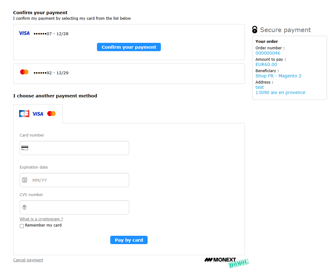 Lors du paiement, vous pouvez activer l'enregistrement de la carte afin que l'acheteur puisse enregistrer sa carte.