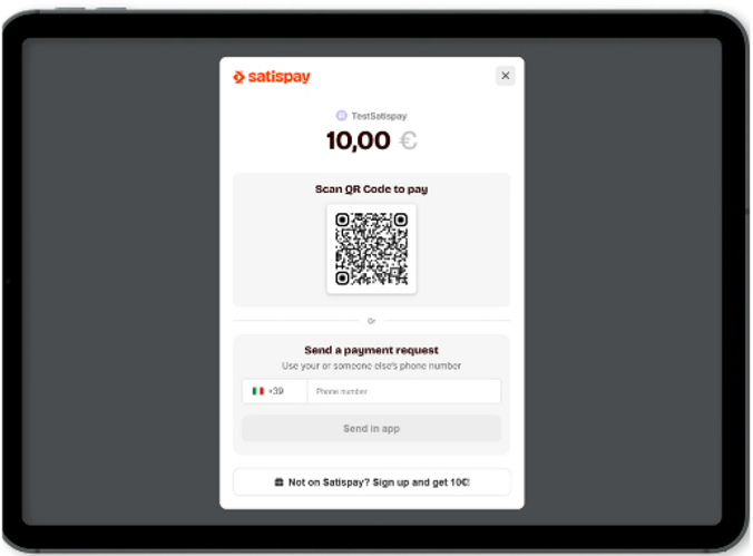 - Il est redirigé sur une page de paiement Satispay sur laquelle, au choix, il saisit son numéro de téléphone portable ou scanne le QR code .