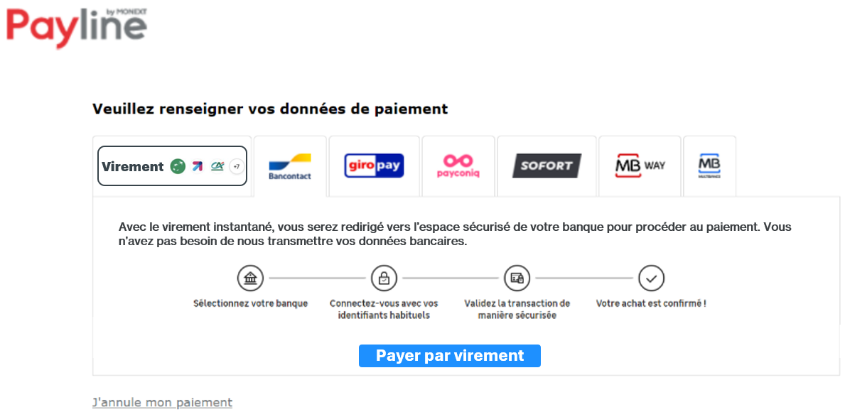 - Le paiement est initié depuis l’environnement bancaire du client, garantissant un haut niveau de confiance.