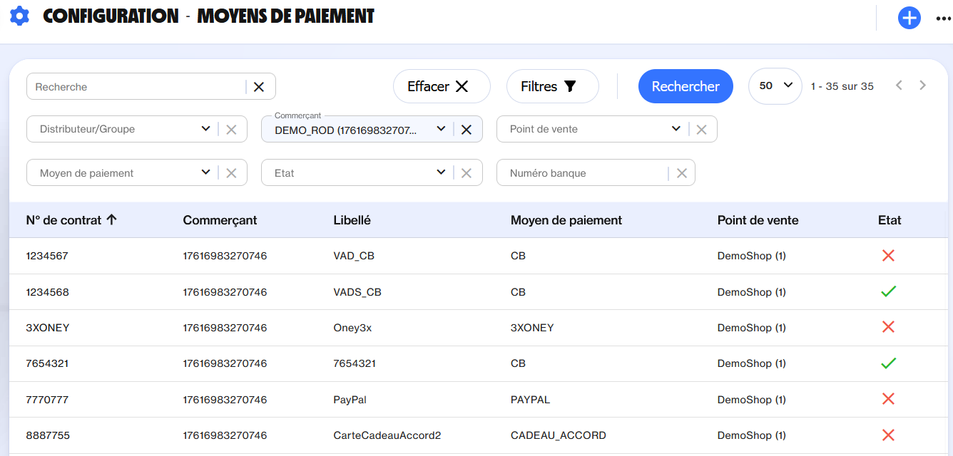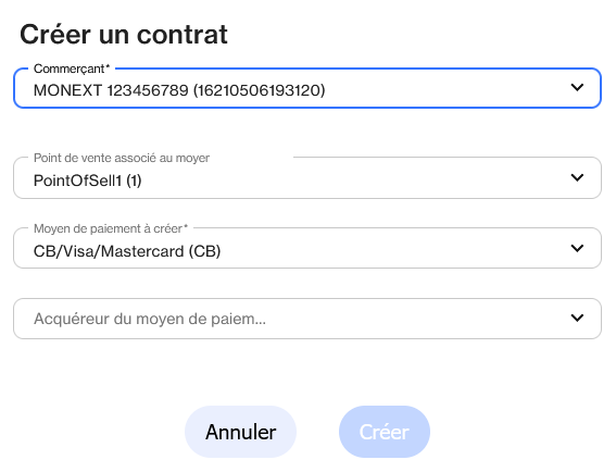 - Numéro de bancaire acquéreur : Numéro du contrat bancaire de l'acquéreur, vous permet de lister les moyens de paiement avec votre numéro fourni par votre acquéreur.