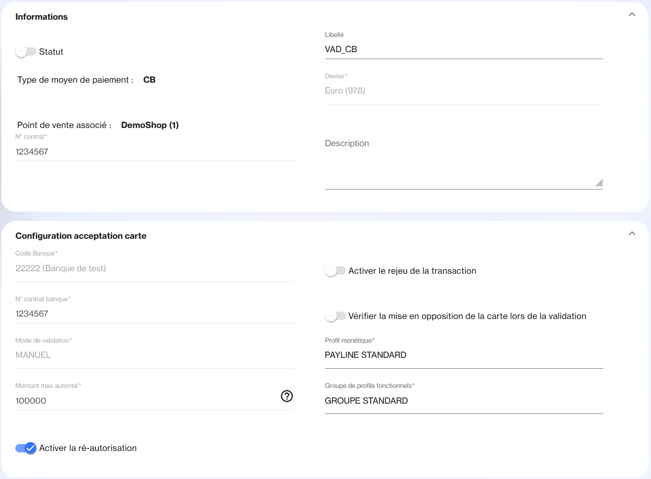 Code banque : associé au contrat du moyen de paiement. Il indique la banque acquéreur du moyen de paiement du contrat bancaire. N° de contrat banque : Représente le numéro du contrat de vente à distance (VAD) souscrit auprès de votre banque pour le moyen de paiement sélectionné. C'est un numéro à 7 chiffres. Mode de validation : Deux modes sont possibles pour valider les autorisations de paiements.