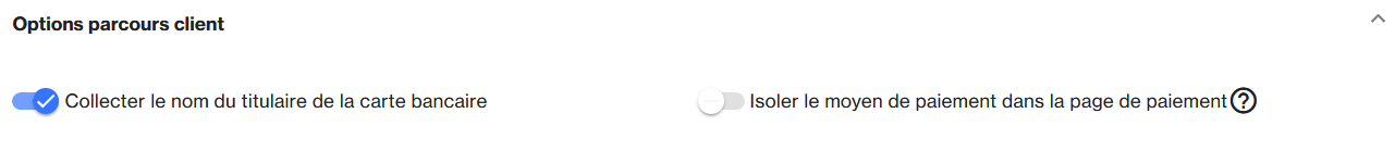 Options parcours client Collecter le nom du titulaire de la carte bancaire : Permet de collecter le prénom et le nom affichés sur la carte bancaire en mode widget. Isoler le moyen de paiement : Cette nouvelle option du contrat permet de personnaliser et mettre en avant un moyen de paiement. Le mode d'intégration Widget (inshop et Pwp v2) propose de regrouper les moyens de paiements du même type, alors pour le séparer afin de privilégier/personnaliser une carte de l'enseigne du commerçant, par exemple, vous devez activer cette option. Disponible pour : AMEX, AURORE, CB, CBPASS, MCVISA, JCB, MAESTRO, DINERS, DISCOVER, FNAC, KANGOUROU, PRINTEMPS, TOTALGR. | |