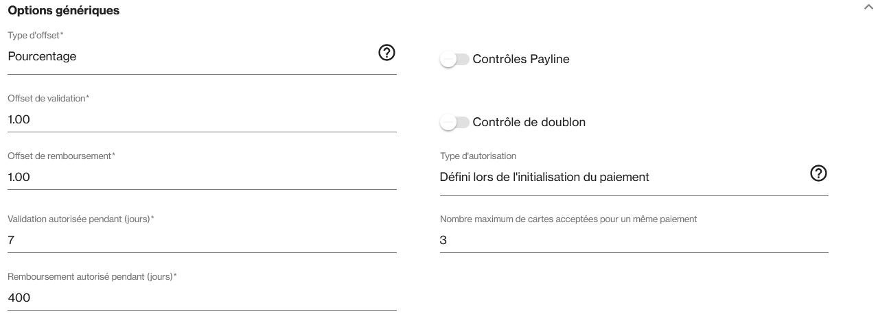 Options génériques Offset : Définir le pourcentage ou valeur acceptée pour le remboursement ou la validation de l'autorisation. Dans certains il est nécessaire de valider plus que l'autorisation. Contrôles Payline : Cet indicateur n'est plus utilisé. Contrôle Doublon : Cette option est disponible permet de contrôler les demandes de paiement en doublon : même temps, même montant et même référence commande. Cela permet aussi d'éviter une erreur ou une fraude. Il est conseillé de modifier la référence commande à chaque paiement. Type d'autorisation : Définir au niveau du moyen de paiement le type de transaction : "autor" ou "autor+valid" pour une intégration en mode intégré. Vous avez désormais la possibilité de choisir le type de paiement : autorisation seule ou autorisation avec débit pour chaque moyen de paiement. Ainsi vous pourrez encaisser à l’expédition pour la CB et encaisser à la commande pour un moyen de paiement 3XCB. Nombre maximum de cartes acceptées pour un même paiement : Cette option permet de proposer le paiement d'une commande avec plusieurs cartes en mode Widget (paiement multi cartes). | |