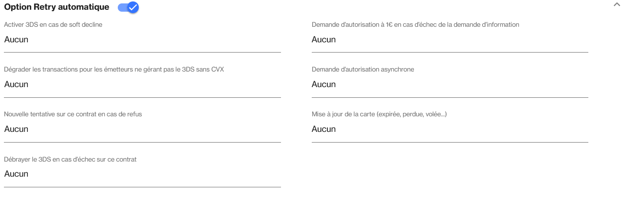 Option Retry automatique Vous pouvez rejouer une transaction et améliorer votre taux d'acceptation. Plus d'information sur la fonction Retry ici. Avec l'option "Activer 3DS en cas de soft decline", vous devez sélectionner dans la liste le numéro de contrat 3DS sur lequel l'authentification doit être réalisé. | |