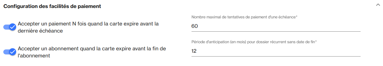 Configuration des facilités de paiement Options de configuration des paiements récurrents et n fois. |