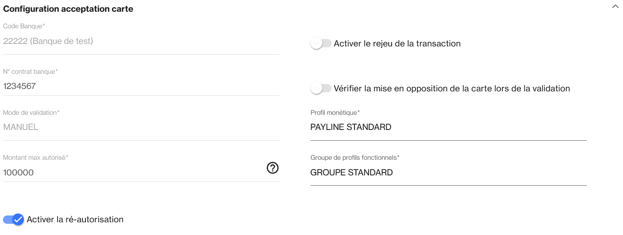 Montant max autorisé : permet d'Indiquer le montant maximum que vous autorisez pour ce moyen de paiement. Activer la ré-autorisation : Permet d'autoriser la réalisation des ré-autorisations des transactions. Activer le rejeu de transaction : Permet d'afficher le bouton "Rejouer une transaction" dans l'écran détail de transaction pour débloquer une transaction par une règle du module de fraude. Activer l'option Vérifier la mise en opposition de la carte lors de la validation : contrôle le fichier de mise en opposition Oppotota lors de la validation de la transaction et lors de la remise. | |
