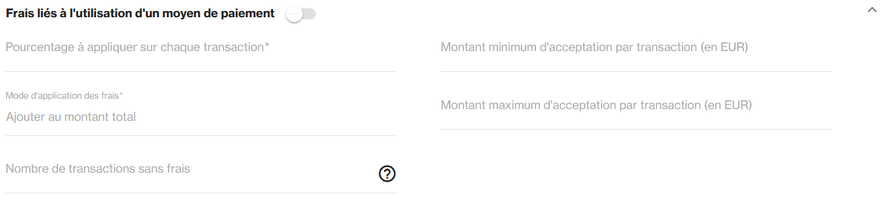 Frais liés à l'utilisation d'un moyen de paiement Vous pouvez gérer les frais supplémentaires d'un moyen de paiement avec cette option. | |