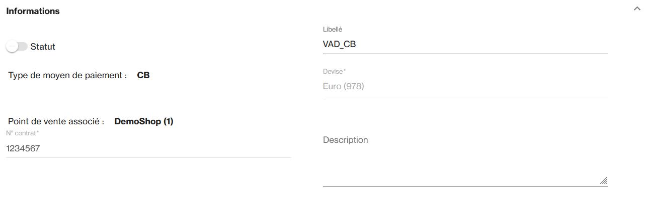 Information Type de moyen de paiement : CB, VISA, MASTERCARD, AMEX, PAYPAL, SOFORT, GIROPAY, iDEAL, COFIDIS, CETELEM, COFINOGA,... Numéro de contrat : Représente un alias du numéro du contrat de vente à distance (VAD) souscrit auprès de votre banque pour le moyen de paiement sélectionné. Devise : Devise définie par le contrat bancaire. Point de vente : associé au moyen de paiement. Libellé : permet de nommer le nom de paiement. Description : information supplémentaire sur le moyen de paiement. | |