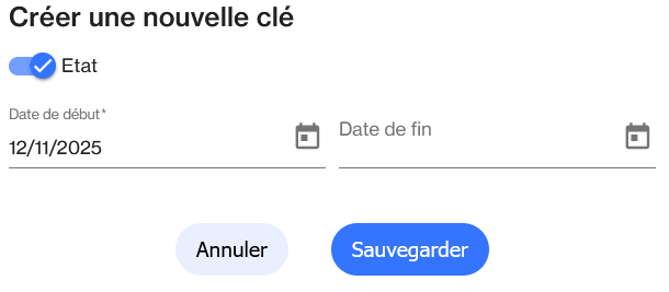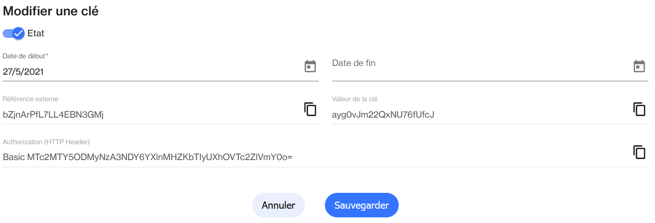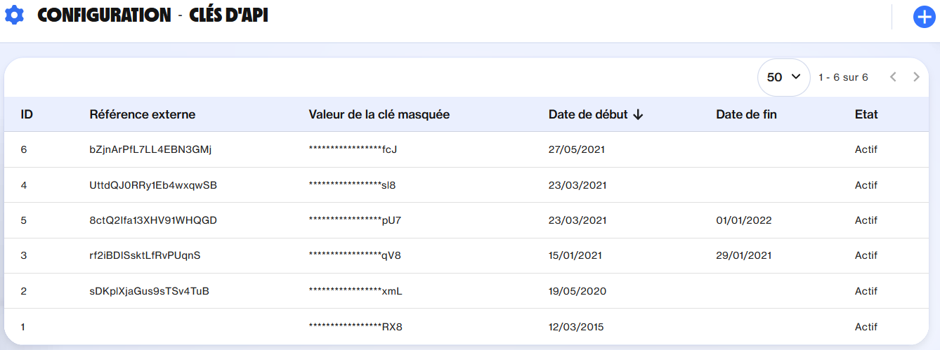 Pour gérer vos clés d'accès API, allez au menu Configuration > Clé d'API. La page ci-dessous s'affiche.