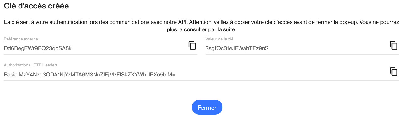 ATTENTION EN PRODUCTION, veillez à copier votre clé d'accès avant de fermer la pop-up. Vous ne pourrez plus la consulter par la suite.