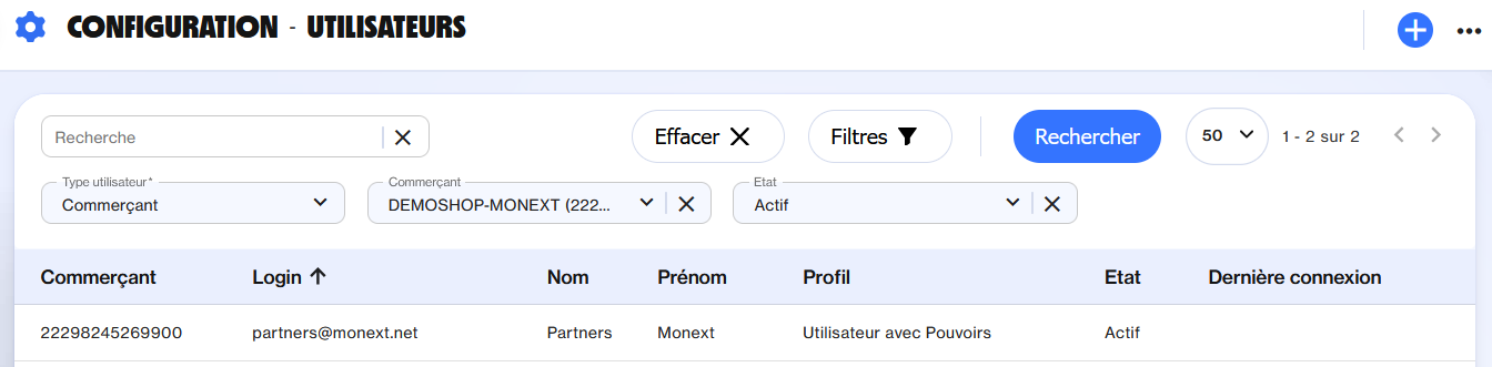 La colonne État dans le tableau ci-dessus indique si votre utilisateur est actif ou non. Cela permet de savoir s'il est autorisé à se connecter au centre d'administration Payline.