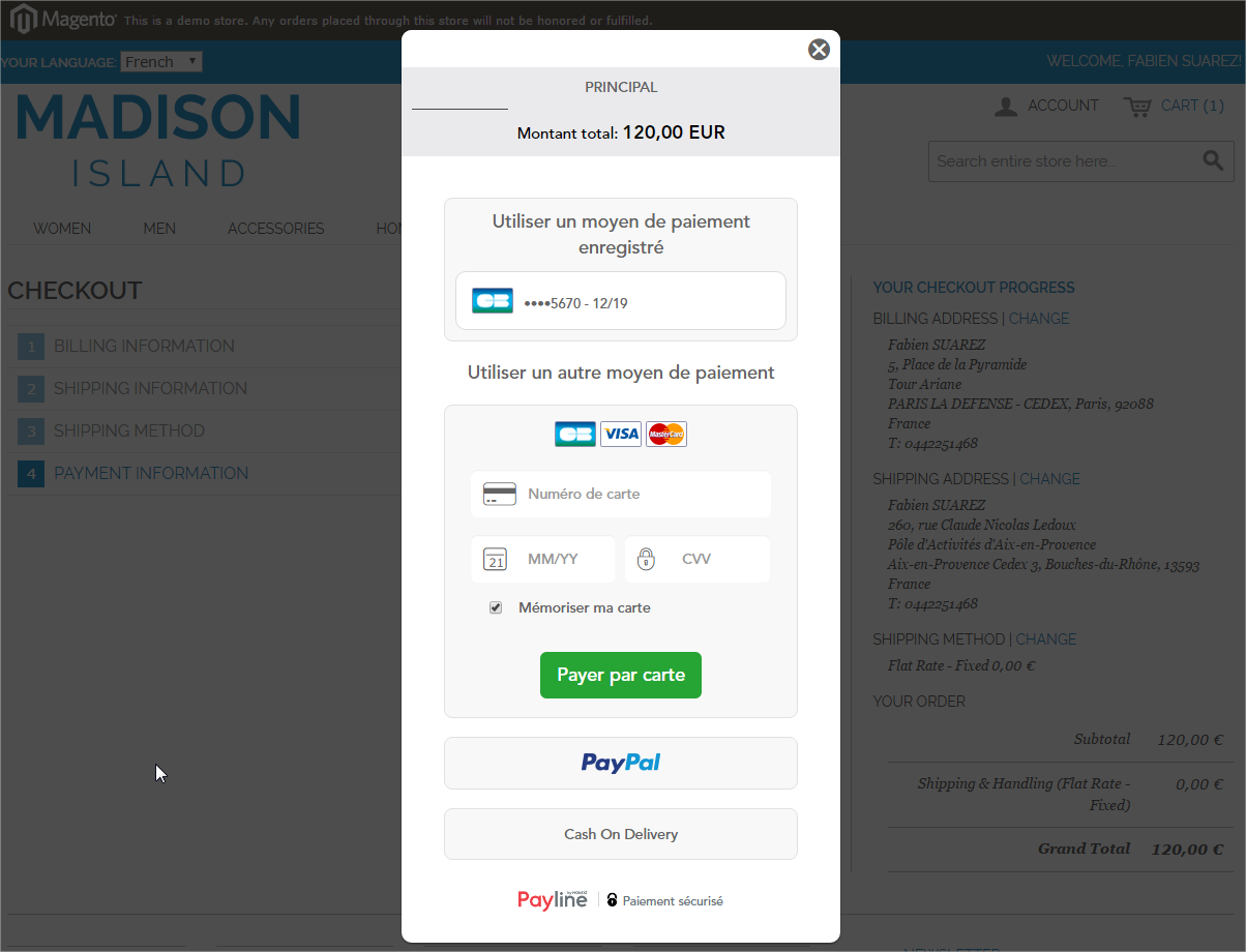 L'interface de paiement sécurisée est intégrée au checkout, et affichée après la sélection de la méthode de livraison selon le style "lightbox" (pop-up avec arrière plan grisé). L'interface intègre le choix du moyen de paiement (y compris les cartes enregistrées et les méthodes non gérées par Payline, Cash On Delivery par exemple), la saisie des données de paiement, l'éventuelle page de saisie du mot de passe 3D Secure et le ticket de paiement : - Embedded tabs