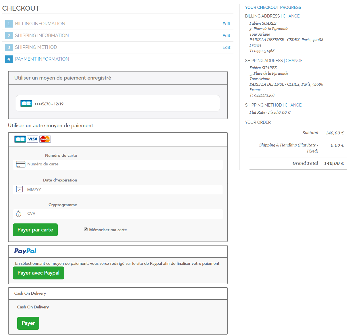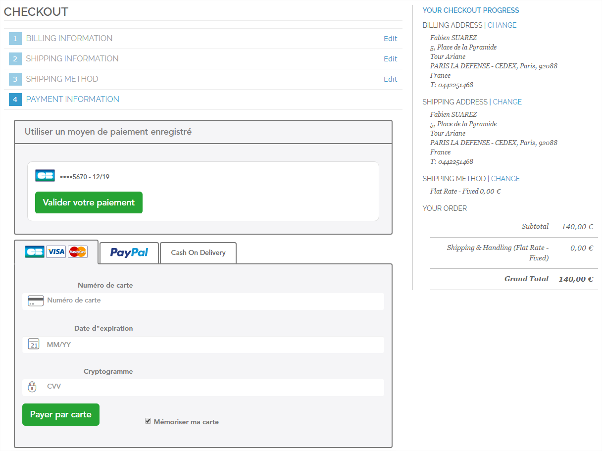 - Une fois ses données les données de paiements saisies, elles sont rappelées dans la rubrique YOUR CHECKOUT PROGRESS (sous les adresses et la méthode de livraison) et le processus de commande se poursuit.