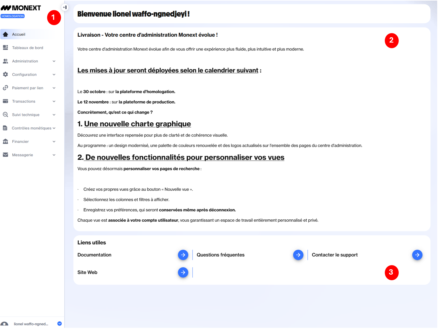 Zone 3 : Espace de travail, dans l'écran d'accueil, vous y trouvez des liens vers la documentation, la FAQ et le formulaire de contact du support Monext.