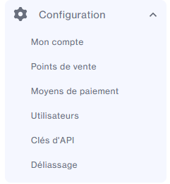 Contenu des menus complets (c'est-à-dire avec le profil administrateur commerçant) :