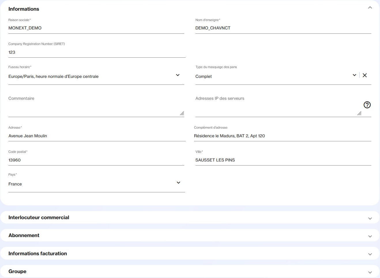 Vous pouvez visualiser et modifier les informations du commerçant ainsi que les données des interlocuteurs : commerciale, technique, sécurité et de facturation.