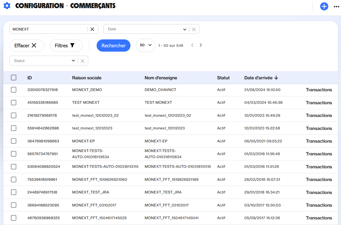 - Recherche rapide : recherche sur la raison sociale et identifiant commerçant ;