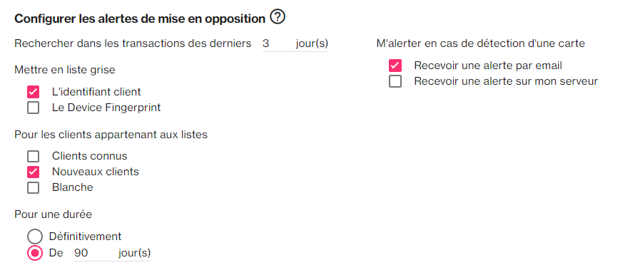 Avec la configuration ci-dessous, si une carte utilisée ces trois derniers jours sur votre site est mise en opposition, l'identifiant client sera mis en liste grise pour une durée de 90 jours si le client appartient à la liste des Nouveaux Clients. Vous recevrez aussi une alerte (n'oubliez pas de configurer les destinataires).