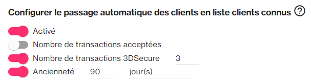Dans l'exemple ci-dessous, l'identifiant du compte client passera en liste clients connus lorsque nous auront comptabilisé 3 transactions authentifiées 3DSecure et que ce compte aurait plus de 90 jours d'ancienneté. Précision : une transaction 3DSecure n'est pas nécessairement une transaction ayant donné lieu à une authentification forte. En effet, en cas de Frictionless (FR) accordé par l'émetteur de la carte bancaire, la transaction est considérée comme "3DS". Nous modifierons probablement cette logique dans un futur proche pour ne prendre en compte que les transactions ayant donné lieu à une authentification forte (CH).