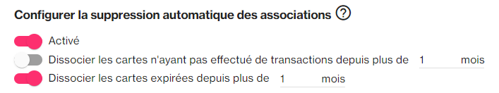 Afin de ne pas pénaliser un client qui changerait souvent de carte, vous pouvez choisir de « casser » les associations client / moyen de paiement lorsque la carte est expirée depuis X mois ou que le moyen de paiement n'a pas été utilisé depuis X mois.
