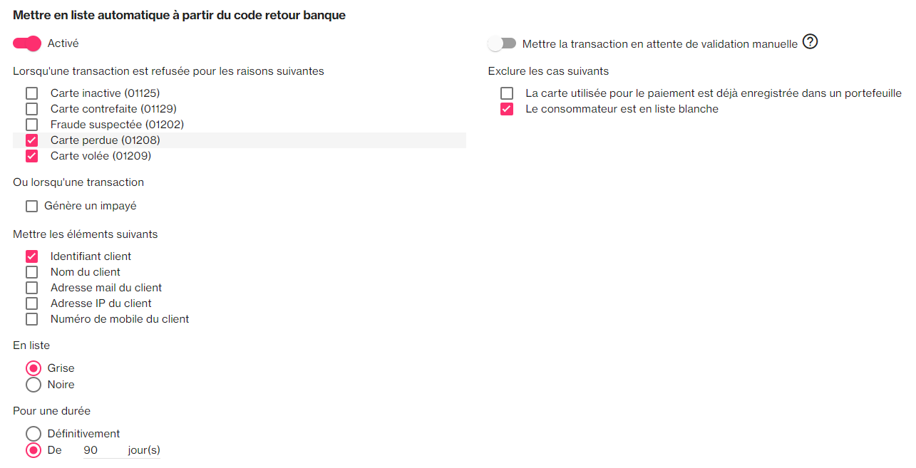 Cette configuration est un bon compromis entre lutte contre la fraude et gêne aux vrais clients. En effet, même si un retour 01208 ou 01209 indique souvent une tentative de fraude, nous remarquons aussi que de nombreux clients légitimes tentent d'utiliser des cartes qu'ils ont pourtant mises en opposition. Ce peut être pour tester qu'elles sont bien annulées ou parce qu'elles sont enregistrées dans un portefeuille qui n'a pas été mis à jour. Il convient donc d'éviter de configurer la mise en liste automatique de manière trop restrictive.