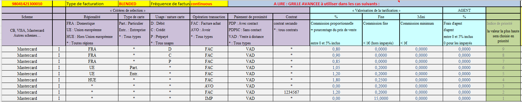 Ainsi, si la grille renvoie 2 possibilités de tarification à partir des attributs de la transaction, le traitement devra sélectionner la priorité la plus haute.