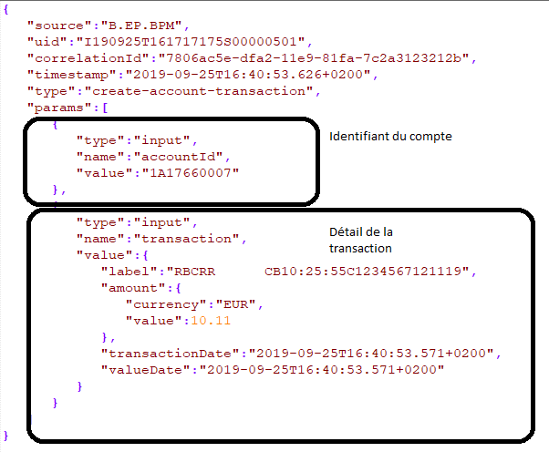 {"source":"B.EP.BPM","uid":"I190925T161717175S00000501","correlationId":"7806ac5e-dfa2-11e9-81fa-7c2a3123212b","timestamp":"2019-09-25T16:40:53.626+0200","type":"create-account-transaction","params":[{"type":"input","name":"accountId","value":"1A17660007"},{"type":"input","name":"transaction","value":{"label":"RBCRR      CB10:25:55C1234567121119","amount":{"currency":"EUR","value":10.11},"transactionDate":"2019-09-25T16:40:53.571+0200","valueDate":"2019-09-25T16:40:53.571+0200"}}]}