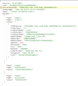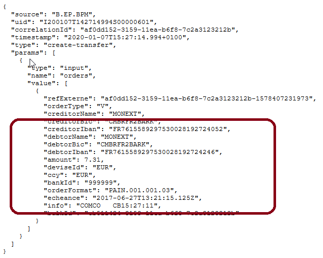 {"source":"B.EP.BPM","uid":"I200107T142714994S00000601","correlationId":"af0dd152-3159-11ea-b6f8-7c2a3123212b","timestamp":"2020-01-07T15:27:14.994+0100","type":"create-transfer","params":[{"type":"input","name":"orders","value":[{"refExterne":"af0dd152-3159-11ea-b6f8-7c2a3123212b-1578407231973","orderType":"V","creditorName":"MONEXT","creditorBic":"CMBRFR2BARK","creditorIban":"FR7615589297530028192724052","debtorName":"MONEXT","debtorBic":"CMBRFR2BARK","debtorIban":"FR7615589297530028192724246","amount":7.31,"deviseId":"EUR","ccy":"EUR","bankId":"999999","orderFormat":"PAIN.001.001.03","echeance":"2017-06-27T13:21:15.125Z","info":"COMCO   CB15:27:11","bulkId":"cb511424-3159-11ea-b6f8-7c2a3123212b"}]}]}