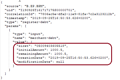 {"source":"B.EP.BPM","uid":"I190925T161717175S00000701","correlationId":"7806ac5e-dfa2-11e9-81fa-7c2a3123212b","timestamp":"2019-09-25T16:50:53.626+0200","type":"register-debt","params":[{"type":"input","name":"merchant-debt","value":{"siret":"05009403605518","initialAmount":1000.5,"remainingAmount":1000.5,"creationDate":"2019-09-25T16:50:53.626+0200","modificationDate":null}}]}
