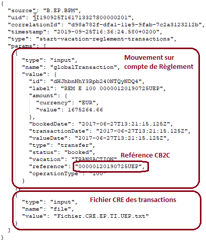 {"source":"B.EP.BPM","uid":"I190925T161713327S00000201","correlationId":"d98a782f-dfa1-11e9-9fab-7c2a3123212b","timestamp":"2019-09-25T16:36:24.580+0200","type":"start-vacation-reglement-transactions","params":[{"type":"input","name":"globalTransaction","value":{"id":"dHJhbnNhY3Rpb240NTQyNDQ4","label":"REM E 100 00000120190725UEP","amount":{"currency":"EUR","value":1675264.66},"bookedDate":"2017-06-27T13:21:15.125Z","transactionDate":"2017-06-27T13:21:15.125Z","valueDate":"2017-06-27T13:21:15.125Z","type":"transfer","status":"booked","vacation":"TRANSACTION","reference":"00000120190725UEP","operationType":"100"}},{"type":"input","name":"file","value":"Fichier.CRE.EP.TI.UEP.txt"}]}