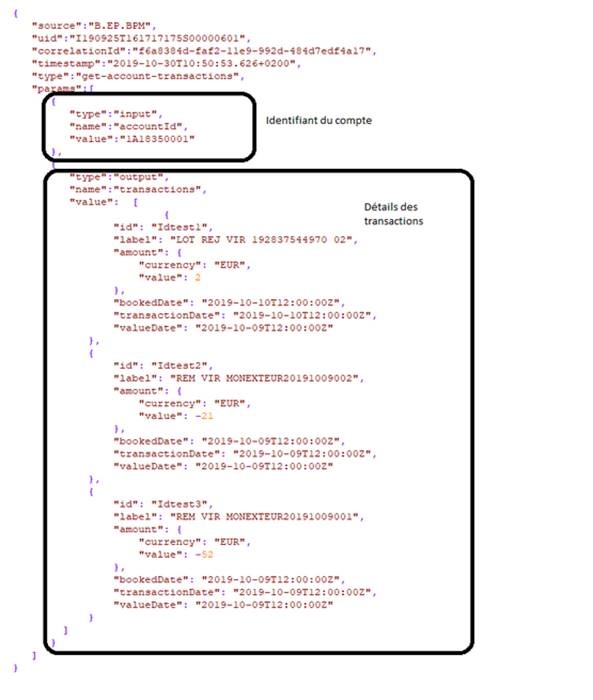{"source":"B.EP.BPM","uid":"I190925T161717175S00000601","correlationId":"f6a8384d-faf2-11e9-992d-484d7edf4a17","timestamp":"2019-10-30T10:50:53.626+0200","type":"get-account-transactions","params":[{"type":"input","name":"accountId","params":[{"type":"input","name":"accountId","value":"1A18350001"},{"type":"output","name":"transactions","value":[{"id":"idTest1", "label":"LOT REJ VIR 192837544970 02","amount":{"currency":"EUR","value":2},"bookedDate":"2019-10-23T12:00:00Z","transactionDate":"2019-09-25T16:40:53.571+0200","valueDate":"2019-09-25T16:40:53.571+0200"} ,{"id":"idTest2", "label":"REM VIR MONEXTEUR20191009002","amount":{"currency":"EUR","value":-21},"bookedDate":"2019-10-23T12:00:00Z","transactionDate":"2019-09-25T16:40:53.571+0200","valueDate":"2019-09-25T16:40:53.571+0200"},{"id":"idTest3", "label":"REM VIR MONEXTEUR20191009001","amount":{"currency":"EUR","value":-52},"bookedDate":"2019-10-09T12:00:00Z","transactionDate":"2019-09-25T16:40:53.571+0200","valueDate":"2019-09-25T16:40:53.571+0200"}]}]}