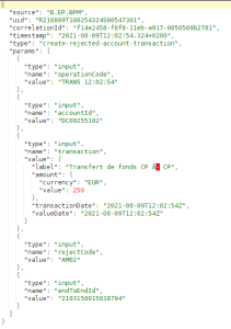 {"source":"B.EP.BPM","uid":"R210809T100254324S00547301","correlationId":"f14e2458-f8f8-11eb-a917-0050569b2781","timestamp":"2021-08-09T12:02:54.324+0200","type":"create-rejected-account-transaction","params":[{"type":"input","name":"operationCode","value":"TRANS 12:02:54"},{"type":"input","name":"accountId","value":"DC09255102"},{"type":"input","name":"transaction","value":{"label":"Transfert de fonds CP à CP","amount":{"currency":"EUR","value":250.00},"transactionDate":"2021-08-09T12:02:54Z","valueDate":"2021-08-09T12:02:54Z"}},{"type":"input","name":"rejectCode","value":"AM02"},{"type":"input","name":"endToEndId","value":"2103150015038794"}]}