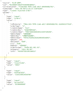 {"source":"B.EP.BPM","uid":"R210809T100257536S00548501","correlationId":"f14e2458-f8f8-11eb-a917-0050569b2781","timestamp":"2021-08-09T12:02:57.536+0200","type":"create-rejected-order","params":[{"type":"input","name":"orders","value":[{"refExterne":"f8bcc303-f8f8-11eb-a917-0050569b2781-1628503377528","orderType":"V","creditorName":"Ext","creditorBic":"SOGEFRPPXXX","creditorIban":"FR0730003000305224397445A56","debtorName":"UNKNOWN","debtorBic":"CMBRFR2BARK","debtorIban":"FR7617028922820289045644093","amount":2E+2,"deviseId":"EUR","ccy":"EUR","bankId":"999999","orderFormat":"PAIN.001.001.03","echeance":"2021-08-09","info":"PAYOUT202105190013"}]},{"type":"input","name":"rejectCode","value":"AG01"},{"type":"input","name":"endToEndId","value":"2103150015038796"},{"type":"input","name":"accountId","value":"DC99999999"}]}