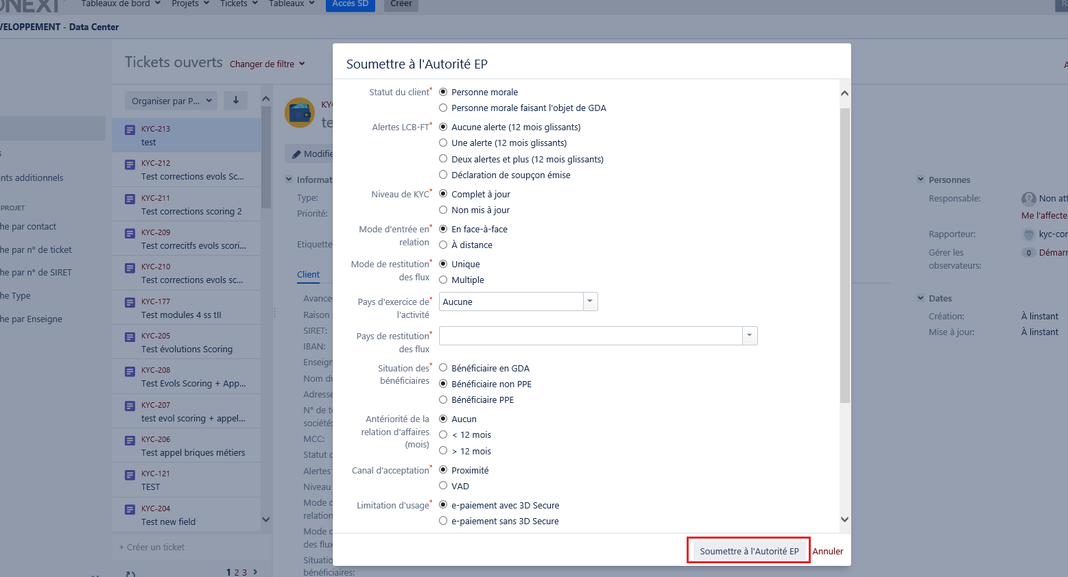 - Cliquer sur le bouton « Soumettre à l'Autorité EP » pour affiner la connaissance client en répondant à un questionnaire.