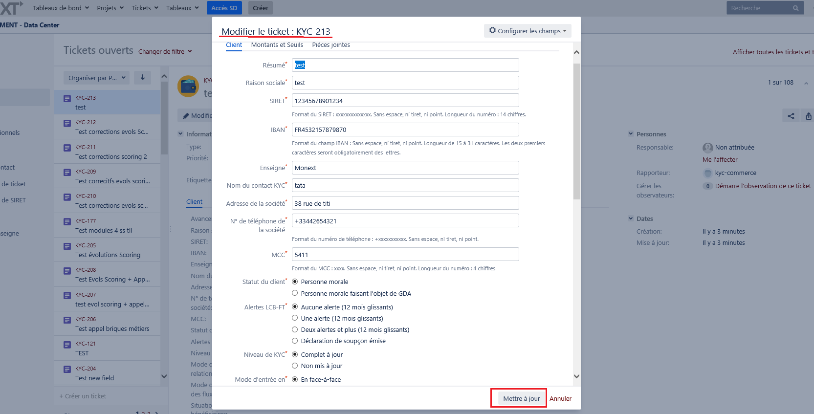 - Si besoin, ajuster les éléments de réponse sur la connaissance client, et cliquer ensuite sur le bouton « Mettre à jour » en bas à droite.