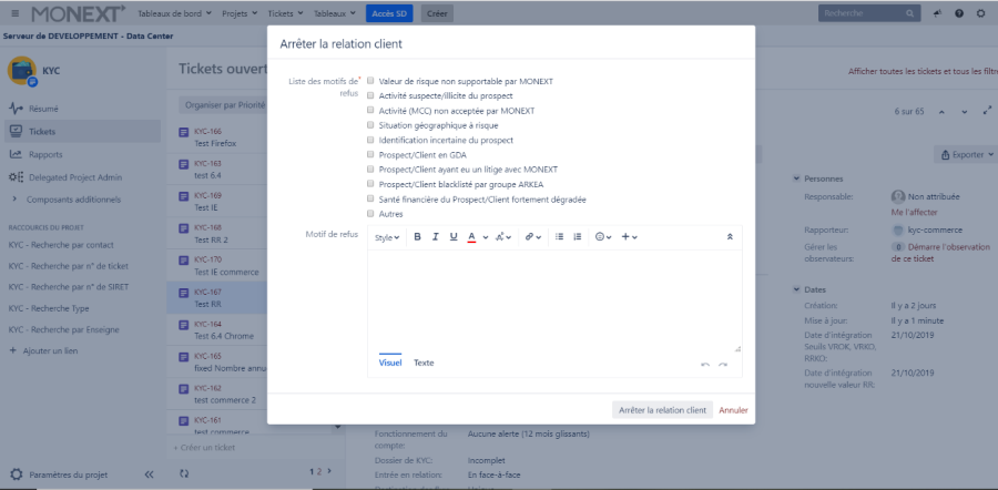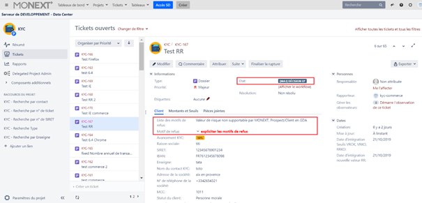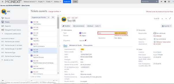 Le statut du ticket devient "[MAJ] DECISION BO", celui-ci est attribué au Back-Office (BO) pour vérifier le dossier et rapporter les mises à jour sur les référentiels ARKEA et MONEXT.