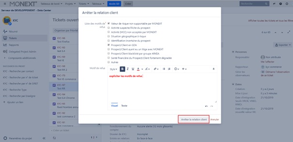 - Cliquer sur le bouton « Arrêter la relation client »