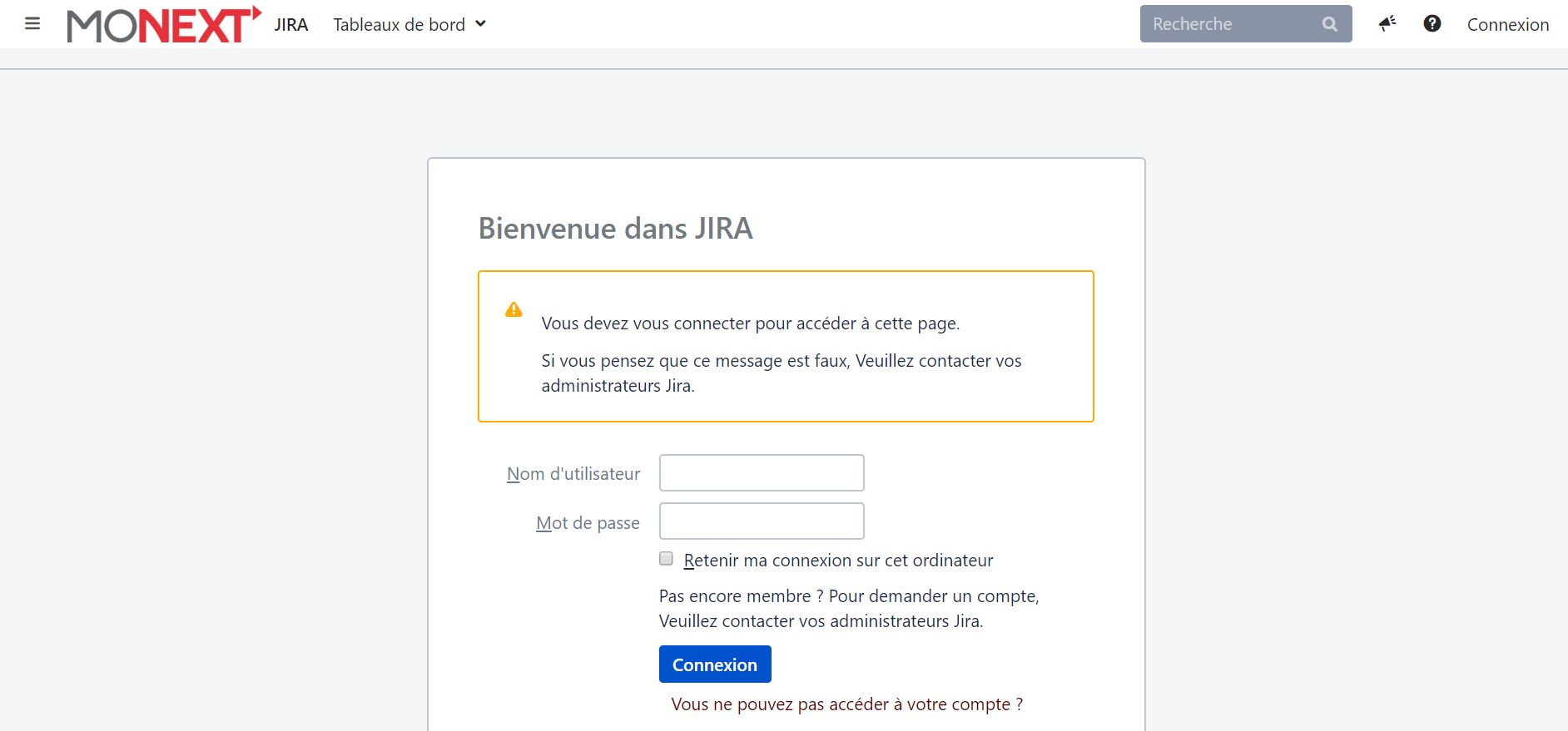- Renseigner Nom d'utilisateur et Mot de passe, puis cliquer sur le bouton Connexion pour accéder à l'application KYC sur JIRA.