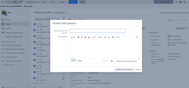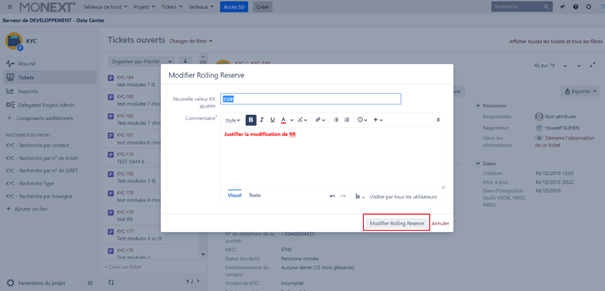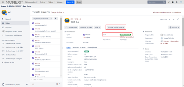 - Sélectionner le ticket pour lequel l’autorité EP souhaite modifier la Rolling Reserve. Celui-ci se trouve à l’état « EN PRODUCTION ».