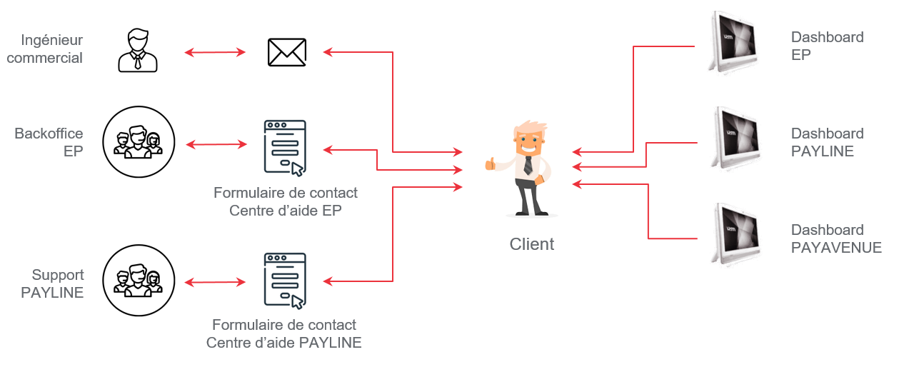Un client peut communiquer avec les acteurs Monext et reçoit des communications de la part de Monext à travers les outils suivants :