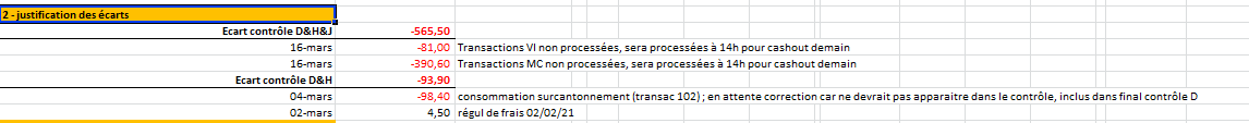 Typiquement, un mouvement qui arrive sur un compte et n'est pas traité par l'EP (à tord ou à raison) avant l'exécution d'un contrôle d'égalité va mettre le contrôle KO et il faut le justifier (J'ai un écart de X qui se justifie par l'arrivée d'une somme X sur le compte Y et cette somme n'est pas encore imputé à un/des commerçant(s) par l'EP).
