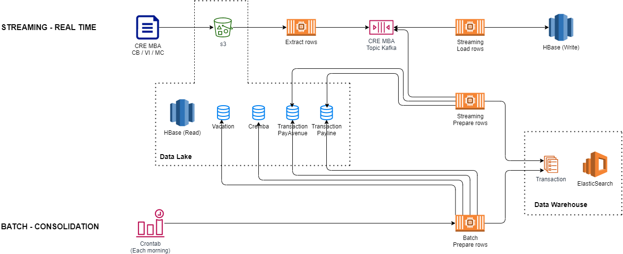 A chaque nouvelle ligne de CRE MBA (transactions CB VI ou MC) qui rentrent dans le Puits, un consumer Streaming est déclenché pour préparer la donnée et la pousser dans l'index Elastic Search. Les données Payline et Payavenue ne sont pas rapprochées à ce moment là car elles n'ont pas encore livrées par les fournisseurs).