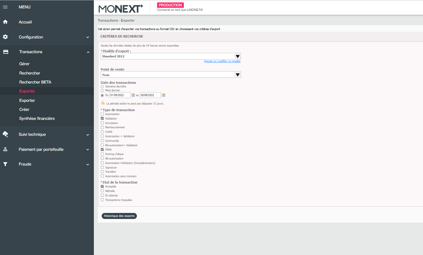 Extraire pour la période considérée, les opérations Limonetik concernant le Client GUY DEMARLE